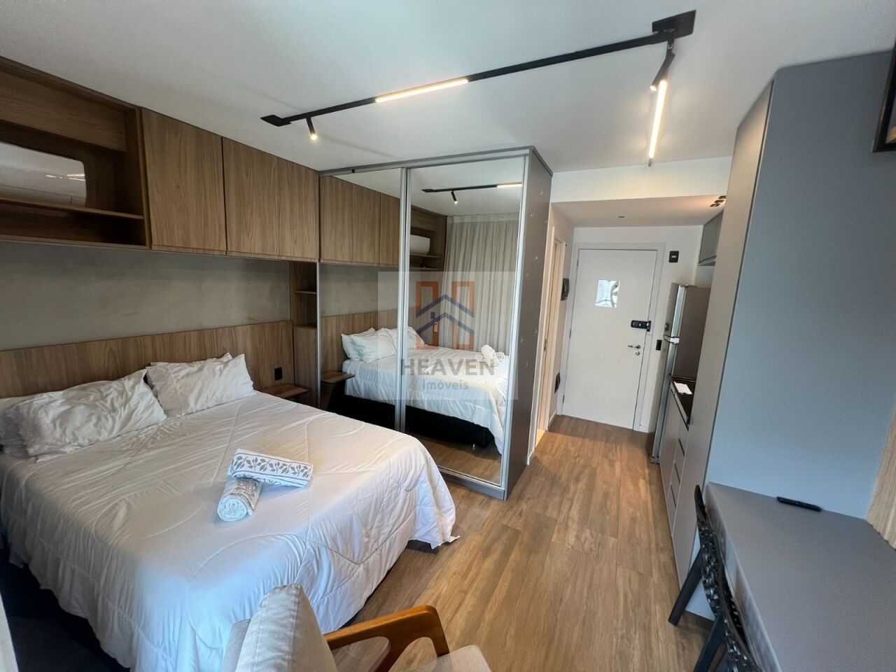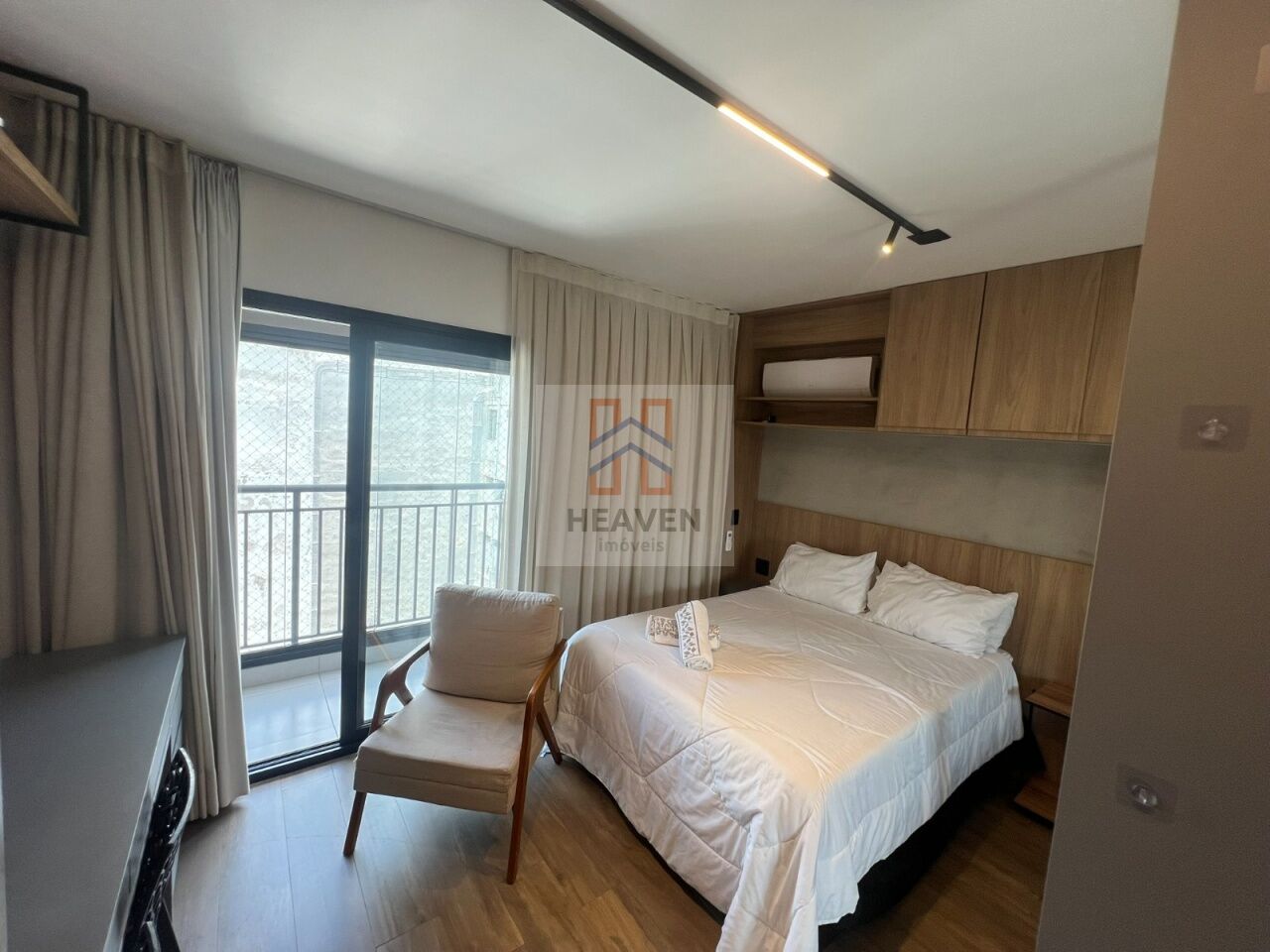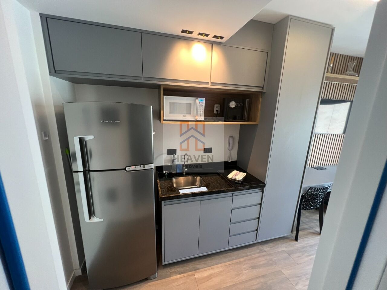 microondas, geladeira frost free, cooktop, TV, cama, guarda-roupa, sofá, box . fechadura eletrônica, espaço de trabalho, tomada USB, ralo no terraço, porta ampla garantindo boa iluminação, Janelas anti ruido, varanda